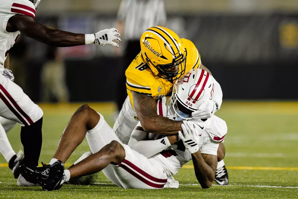 Mizzou LB Jeremiah Beasley brings down a UMass ballcarrier during Saturday’s NCAA football game at Faurot Field. (Photo: Ellie Parker)