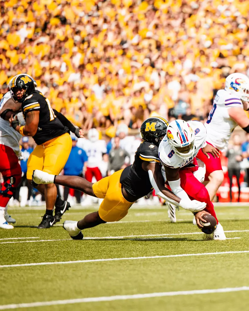 Kansas had one last chance, but Missouri stopped them on a three-and-out, thanks to a big-hit tackle by linebacker Josiah Trotter, which gave the Tigers the ball back with just over two minutes left.