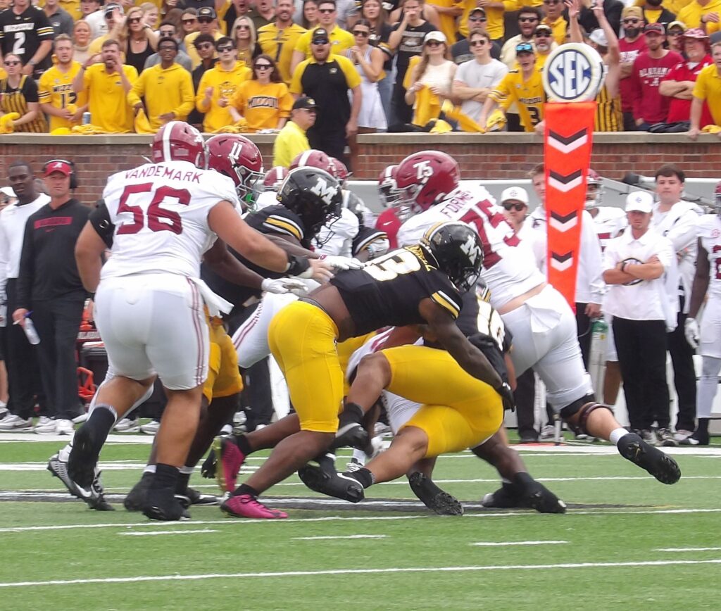 The Tigers came out roaring in the third quarter. The defense sacked Bama quarterback Ty Simpson and forced a fumble, which Mizzou recovered at the Tide 19-yard line.