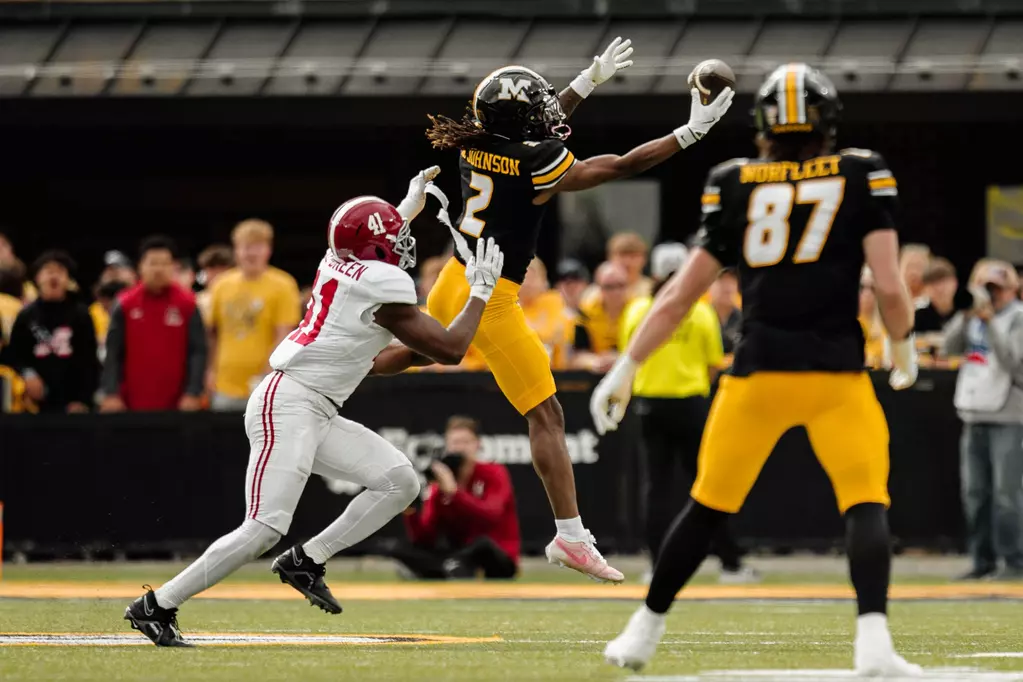 Mizzou WR Marquis Johnson makes a leaping catch during the third quarter of the Tigers’ game against Alabama on Saturday. (Photo: Terrance Williams)
