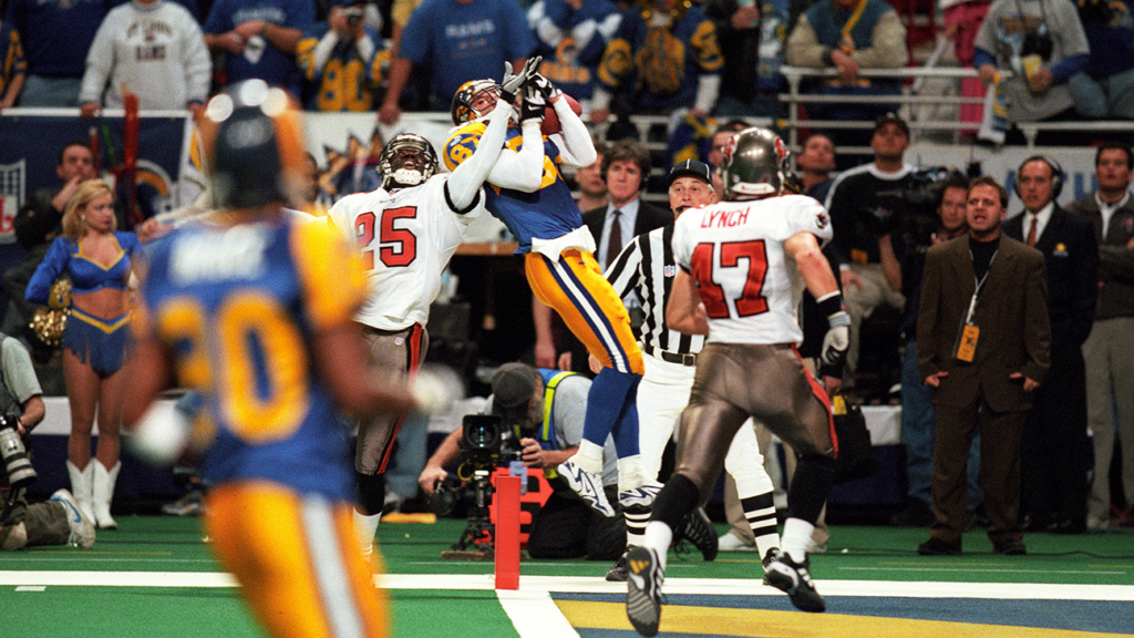 Ricky Proehl makes the game-winning TD catch in the St. Louis Rams’ 1999 NFC Championship Game victory over Tampa Bay. (Photo courtesy: Getty Images)