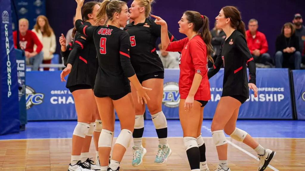 NORMANDY, MO — The University of Missouri-St. Louis women’s volleyball team clinched its third Great Lakes Valley Conference regular season title in the last four years, thanks to a 3 sets-to-1 win over Rockhurst University on Saturday afternoon at the Mark Twain Building.