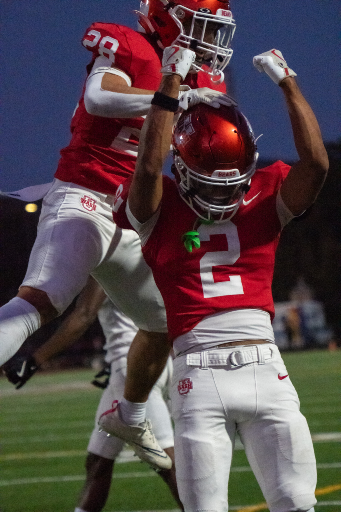 WashU players celebrate scoring a touchdown during Saturday’s CCIW football game at Francis Olympic Field. (Photo: Thomas Grove)