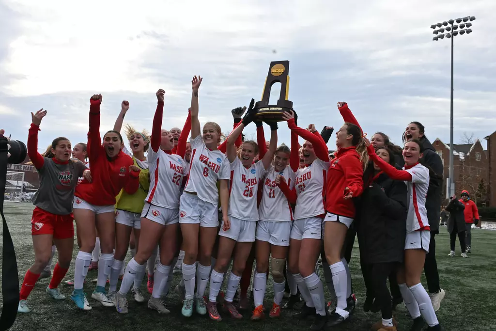 The WashU women’s soccer team celebrates winning their second straight NCAA championship. (Photo courtesy: WashU Athletics)